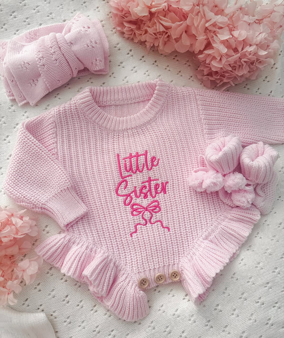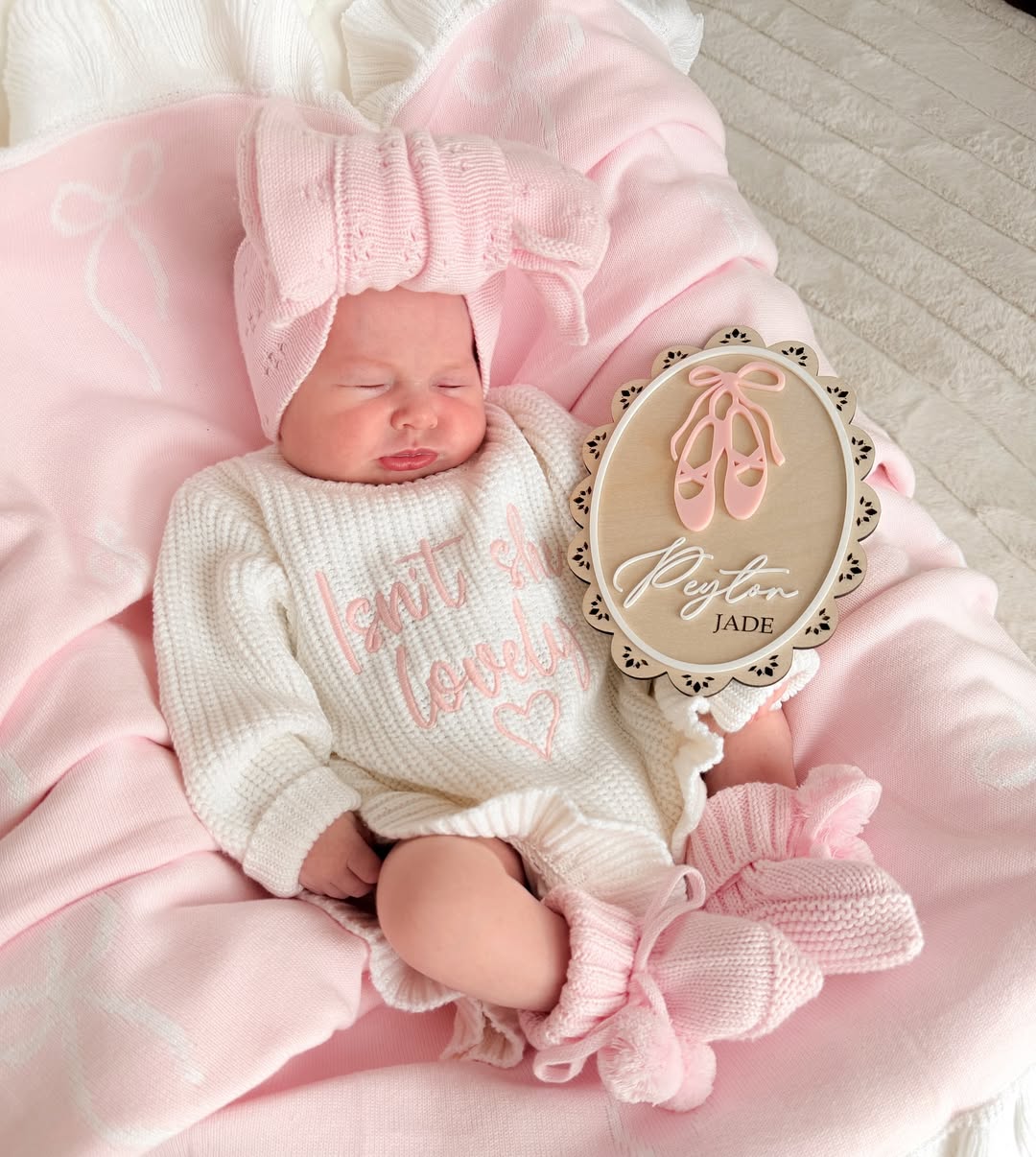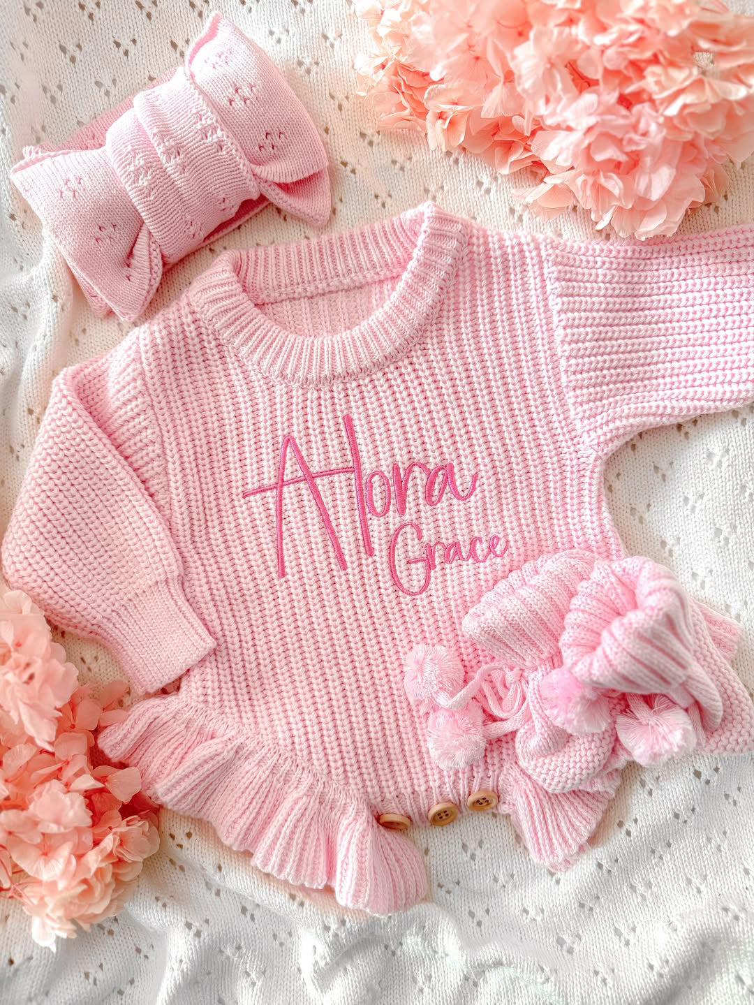 Shop our stunning chunky knit baby romper, with a soft pink “she’s here” made on 100% cotton so it’s beautiful and soft on your newborns skin!