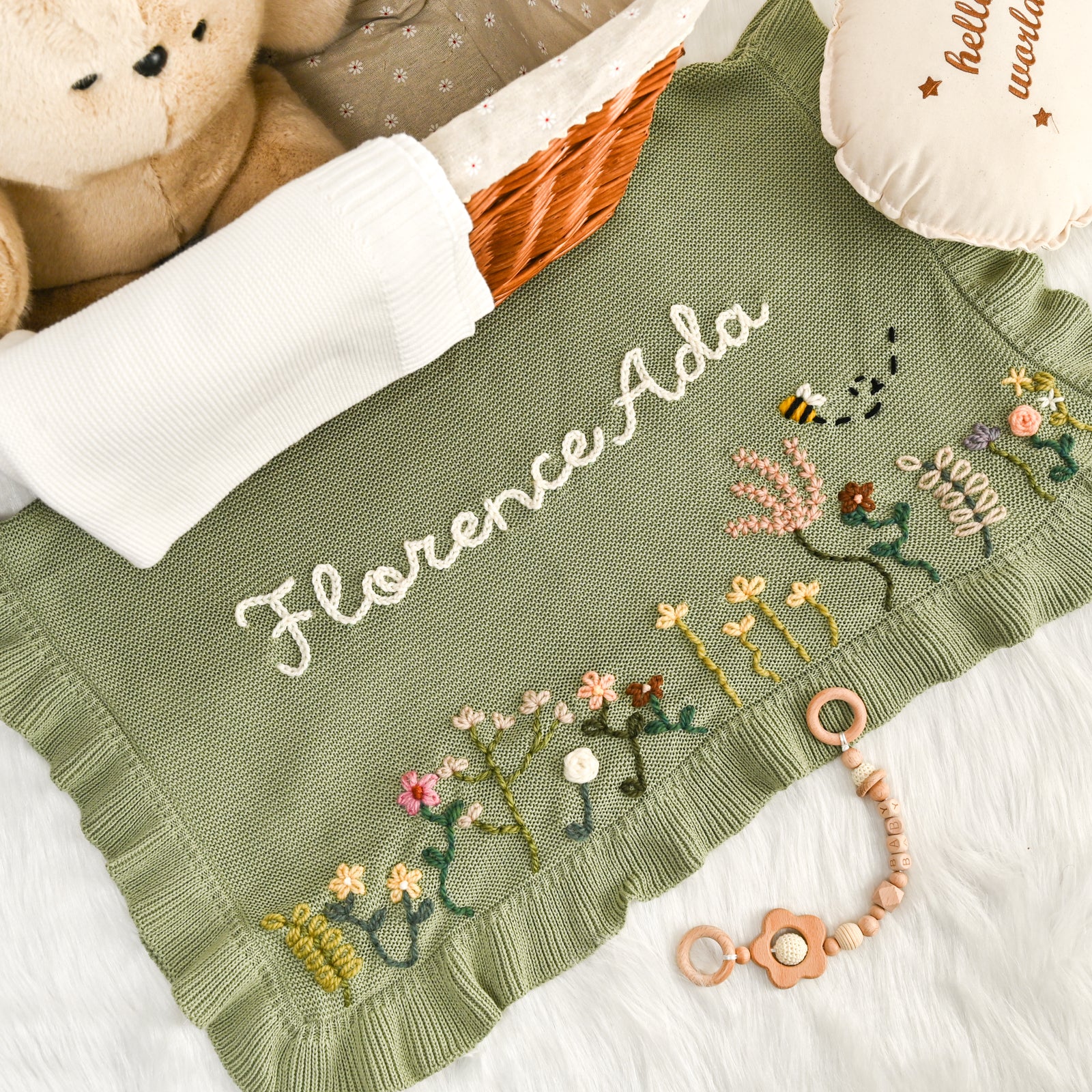 Cozy up with our Hand-Knitted Floral Blanket. Perfect for all seasons, this blanket is the perfect gift or keepsake for your baby! Together with you, I will handembroider a custom design and colours that you have chosen.